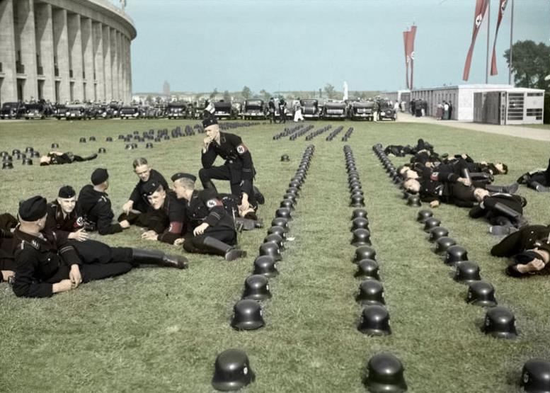 Schutzstaffel cadets resting on the south lawn of the Olympic Stadium in Berlin, Germany, August 1936